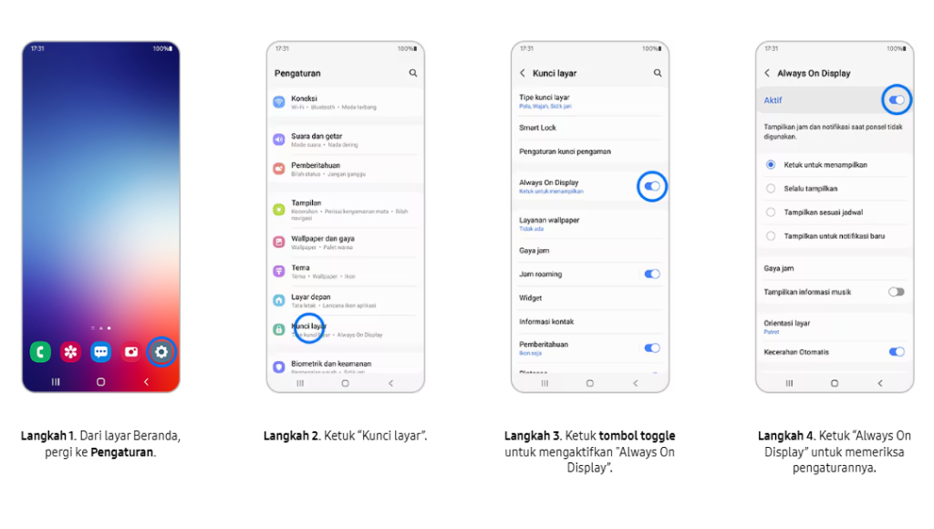 Kamu bisa mengaktifkannya lewat Quick Settings dengan geser layar dan ketuk ikon AOD, atau melalui menu Settings → Lock screen → Always On Display lalu aktifkan switch. Dari sini kamu juga bisa atur gaya tampilan sesuai selera. - Apa saja manfaat menggunakan Always On Display Samsung?