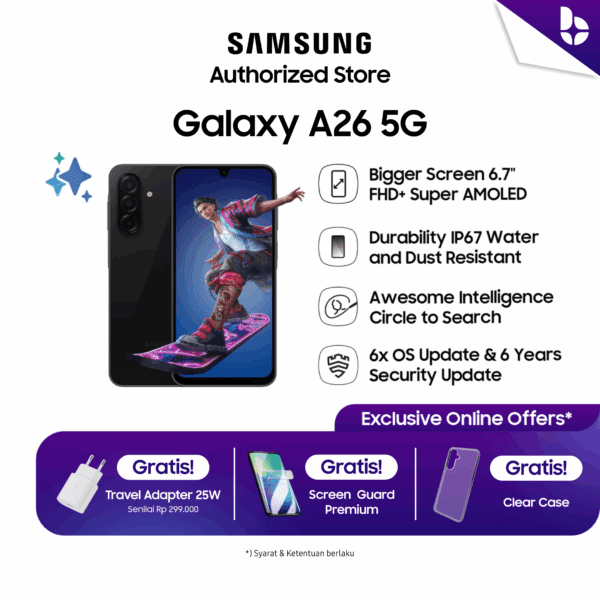Selamat datang di era konektivitas super cepat yang kini semakin terjangkau. Samsung Galaxy A26 5G hadir untuk Anda yang menginginkan pengalaman smartphone modern dengan kecepatan 5G, memori super lega, dan fitur-fitur esensial yang andal untuk menemani setiap aktivitas. Abadikan momen, nikmati hiburan, dan tetap terhubung tanpa hambatan dengan perangkat cerdas yang dirancang untuk kebutuhan digital Anda.