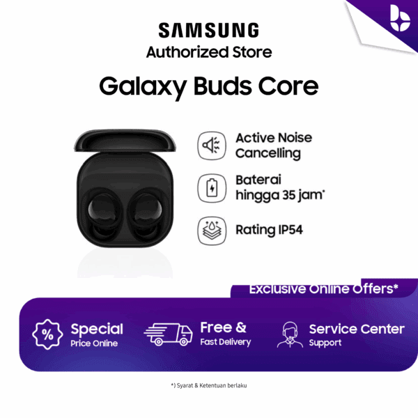 Galaxy Buds Core menghadirkan pengalaman audio jernih dengan speaker 1-way, 6 mikrofon, serta fitur ANC dan Ambient Sound untuk kenyamanan mendengar di berbagai situasi. Dengan desain ringan hanya 5,3 g dan sertifikasi IP54, earbuds ini praktis dipakai sepanjang hari sekaligus tahan debu dan percikan. Ditenagai baterai hingga 35 jam pemutaran, konektivitas Bluetooth 5.4, serta dukungan Samsung Find, Buds Core siap mendukung aktivitas harian Anda.”