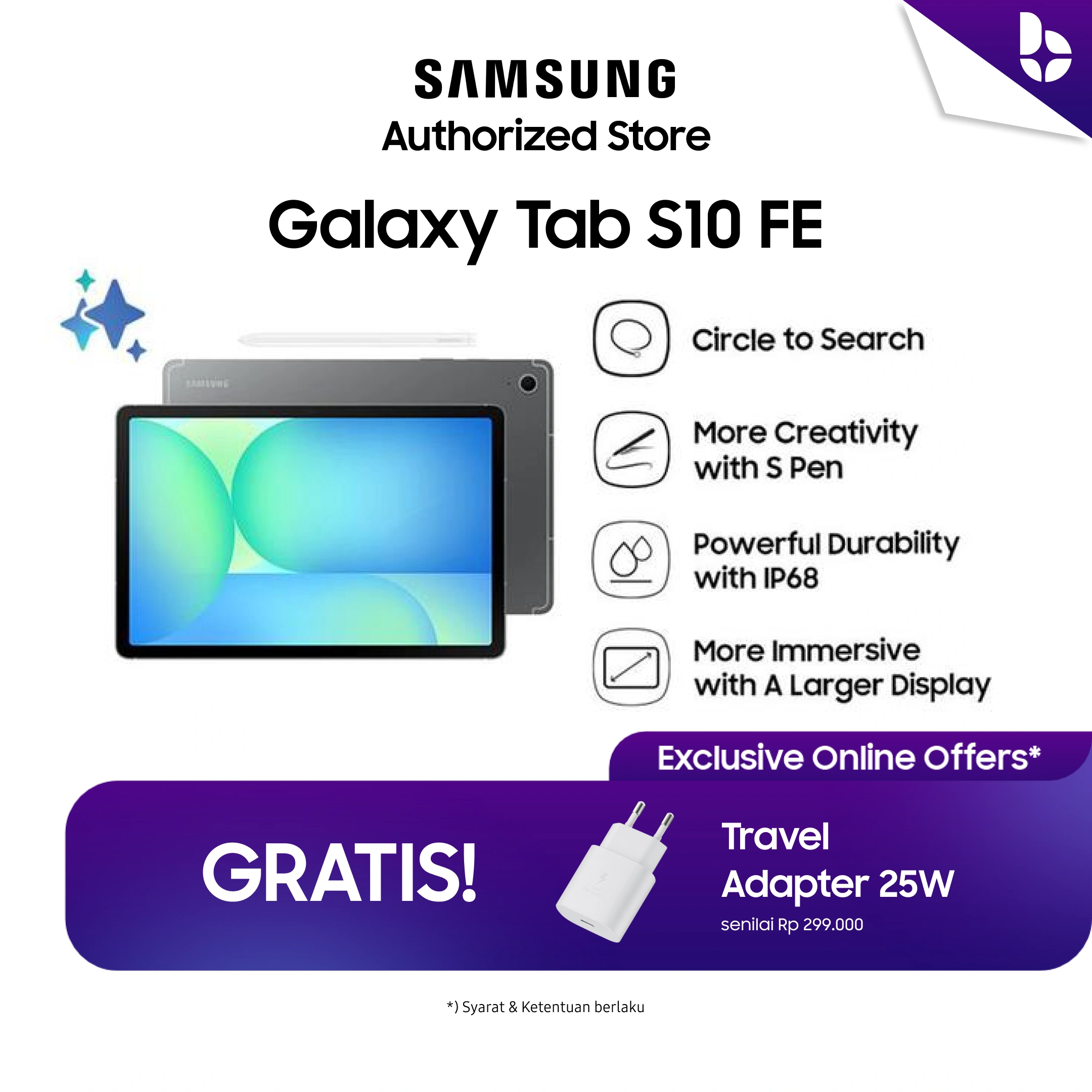 Temukan sahabat kreatif serbaguna yang dirancang untuk mengikuti setiap gerak Anda. Inilah Samsung Galaxy Tab S10 FE, tablet yang merangkum semua fitur esensial yang Anda cintai dalam desain yang ringkas dan portabel. Baik untuk mencatat ide di kafe, menyelesaikan pekerjaan di perjalanan, atau bersantai di sofa, Tab S10 FE adalah partner ideal yang menyeimbangkan performa andal dengan kenyamanan mobilitas sempurna.