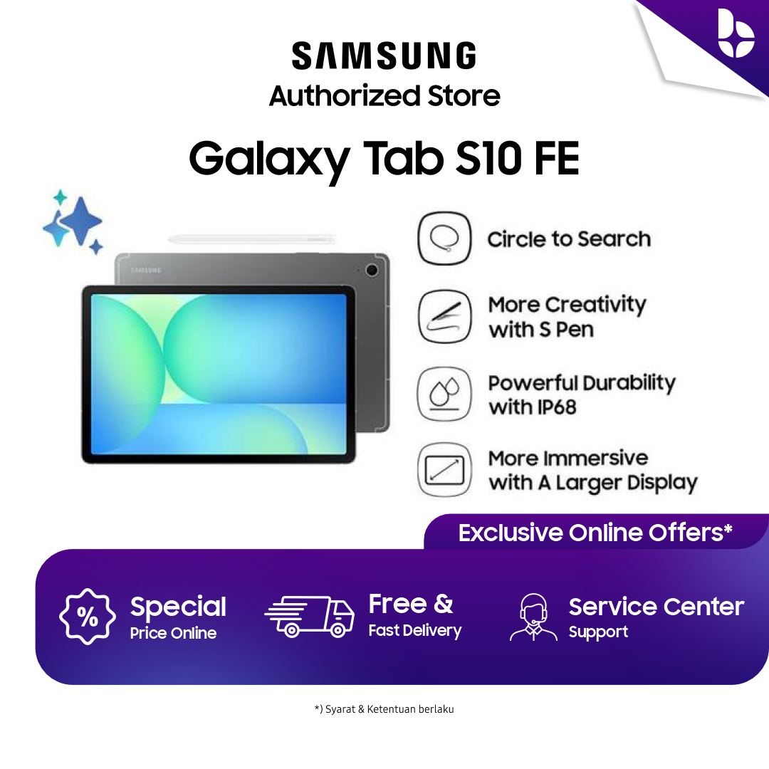 Temukan sahabat kreatif serbaguna yang dirancang untuk mengikuti setiap gerak Anda. Inilah Samsung Galaxy Tab S10 FE, tablet yang merangkum semua fitur esensial yang Anda cintai dalam desain yang ringkas dan portabel. Baik untuk mencatat ide di kafe, menyelesaikan pekerjaan di perjalanan, atau bersantai di sofa, Tab S10 FE adalah partner ideal yang menyeimbangkan performa andal dengan kenyamanan mobilitas sempurna.